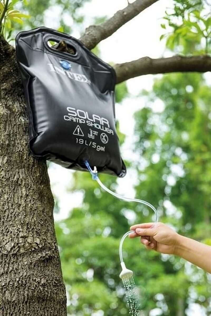 Походный душ Intex 28052 - состоит из пвх мешка для воды, гибкого шланга и рукоятки-душа. ПВХ мешок черного цвета, а, как известно, черный цвет поглощает больше ультрафиолетовых лучей, что способствует быстрому нагреву содержащейся в нем воды. Емкость душа составляет 19 литров. Размеры: 20x5x28 см.